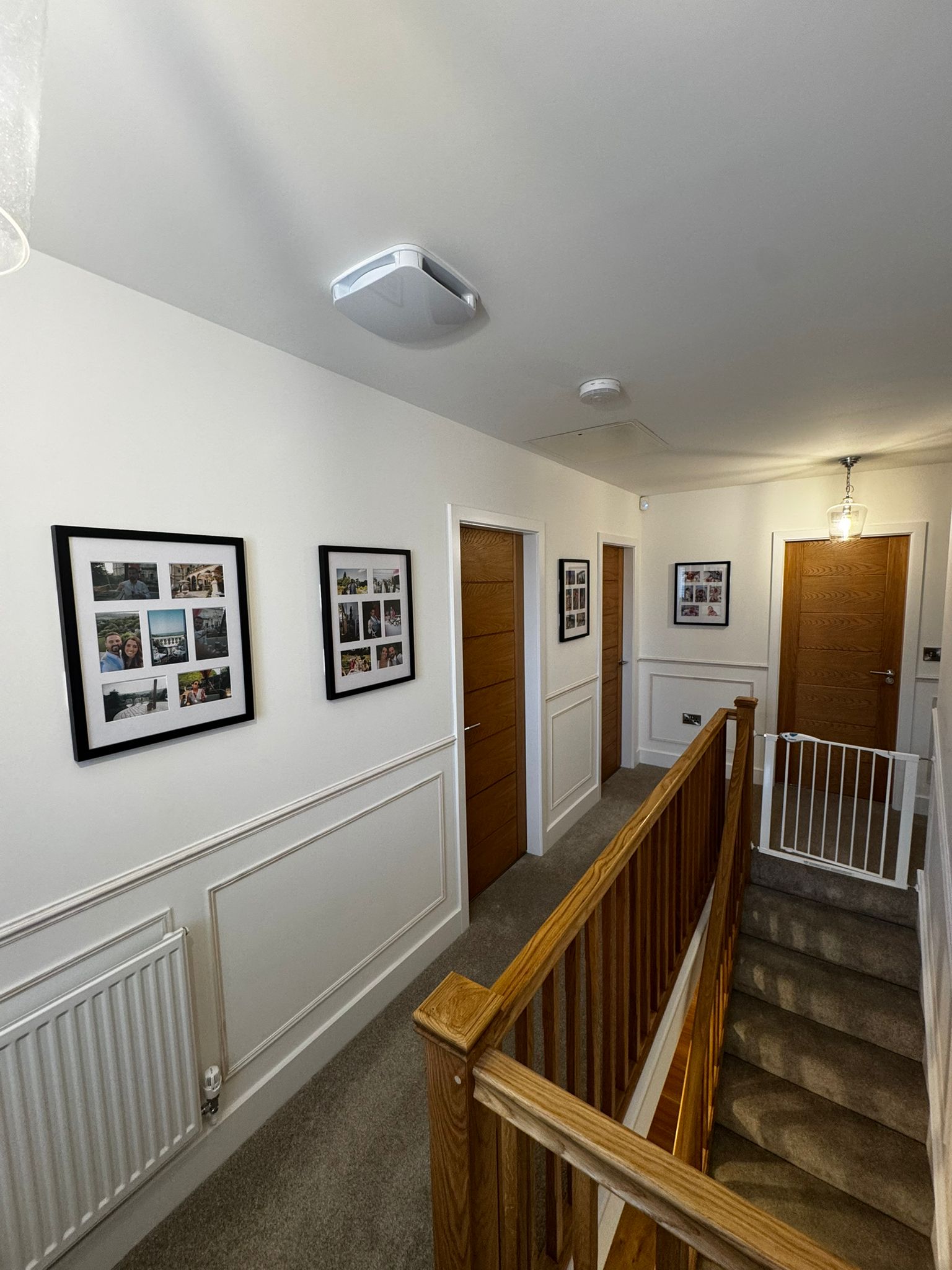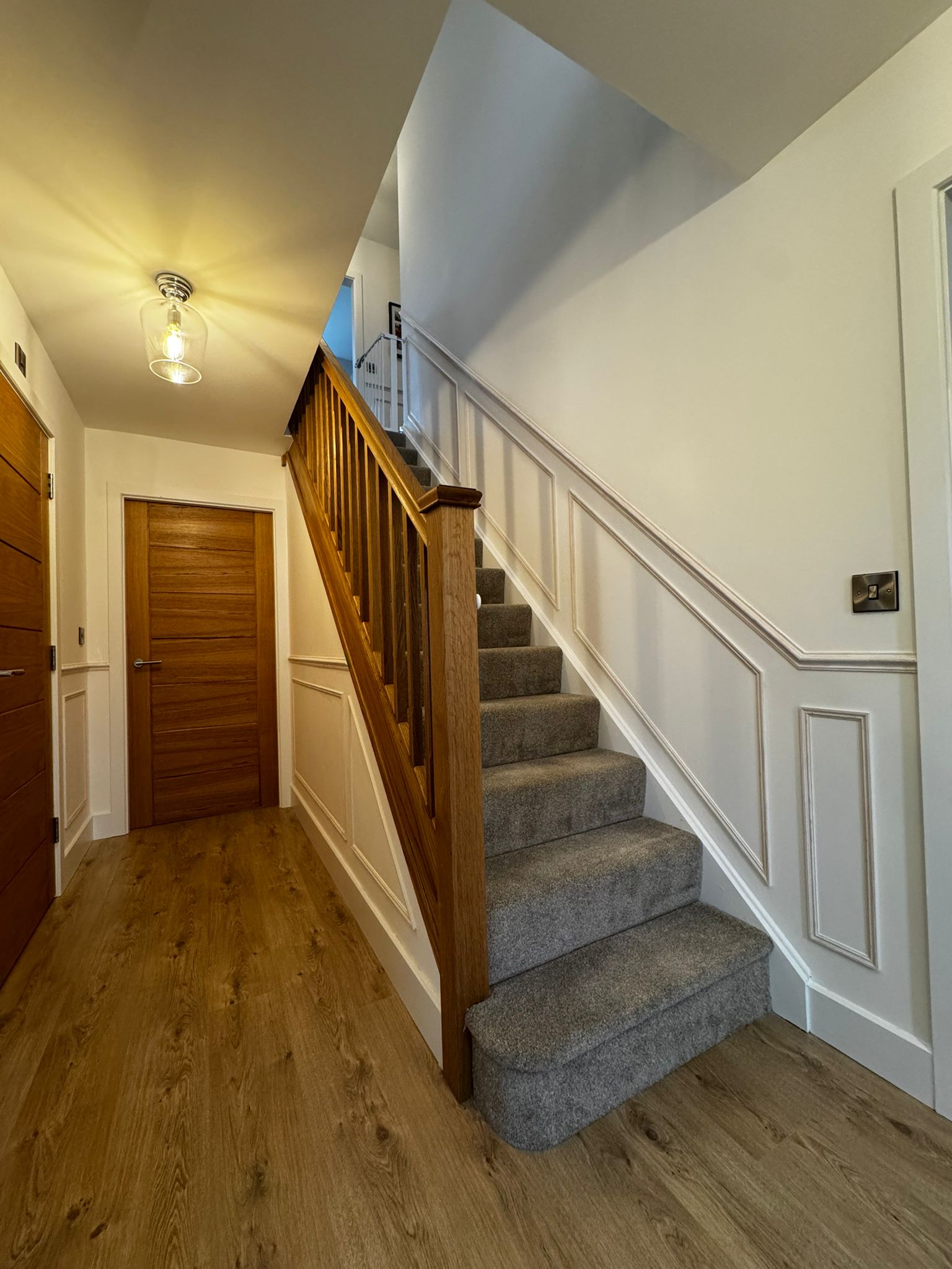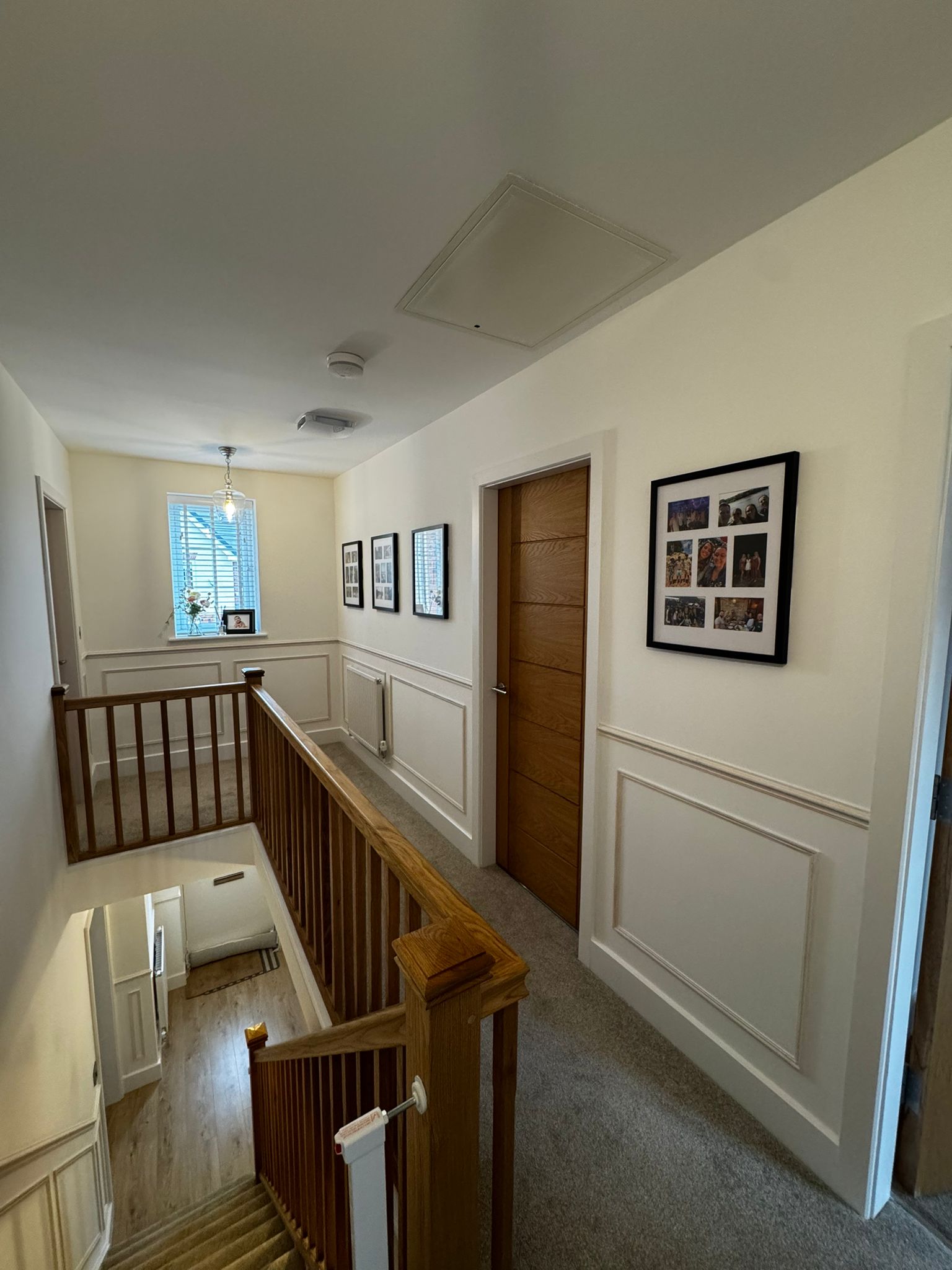 Switch Media Walls transformed this Mountsorrel home’s landing and hallway with bespoke, high-end decorative wall panelling. This lining adds a touch of classic elegance, significantly enhancing the aesthetic and perceived value of the property. A perfect example of our tailored interior design solutions for East Midlands homeowners.